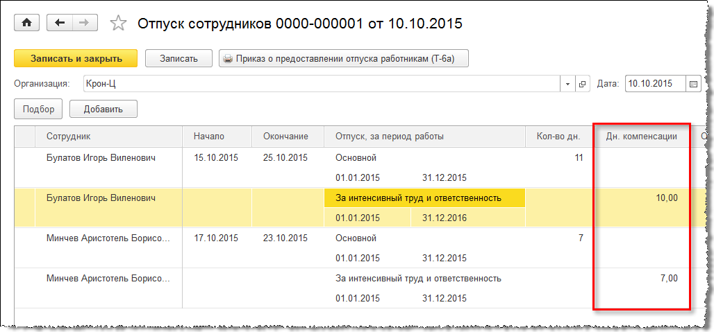 В документе «Отпуска сотрудников» реализована возможность указать количество дней компенсации отпуска.