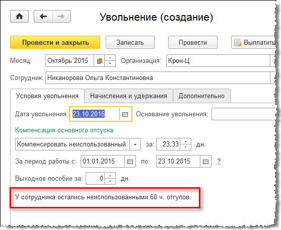 Если на момент увольнения у сотрудника остались неиспользованные отгулы, в документе теперь выдается соответствующее сообщение. Оно носит информационный характер: решение о последующих действиях остается за пользователем.