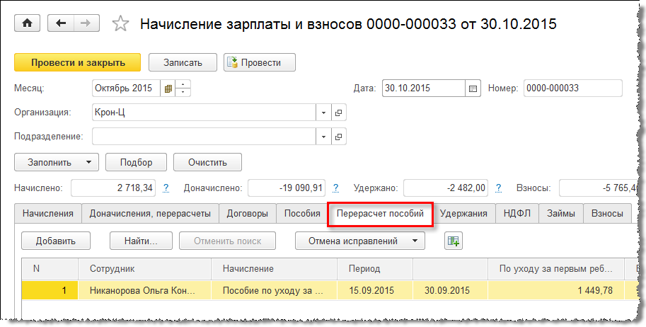 В документ «Начисление зарплата и взносов» добавлена закладка «Перерасчет пособий», на которой отражаются результаты перерасчета или доначисления пособий за прошлые периоды.