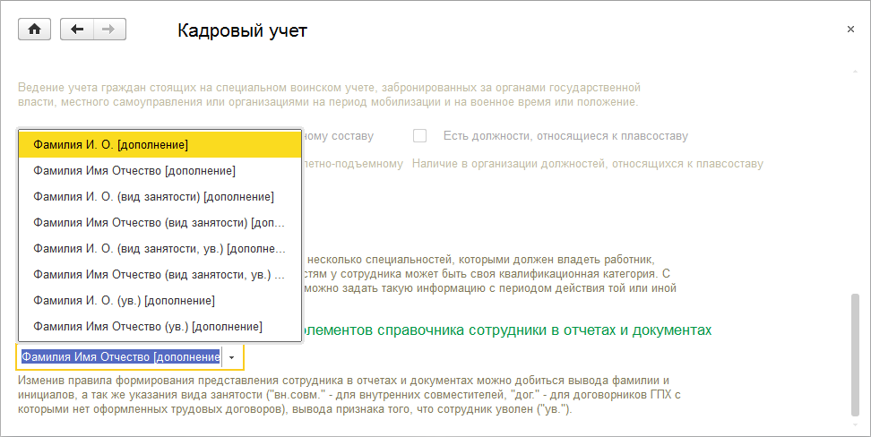 По умолчанию выбран вариант «Фамилия Имя Отчество [дополнение]», и наименования сотрудников отображаются как и ранее.