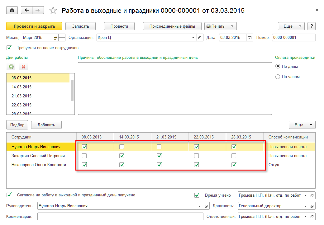 Реализована возможность одним документом «Работа в выходные и праздники» оформить работу разных сотрудников в разные дни. В случае оплаты по дням факт работы конкретного сотрудника в конкретный день отмечается установкой флажка.
