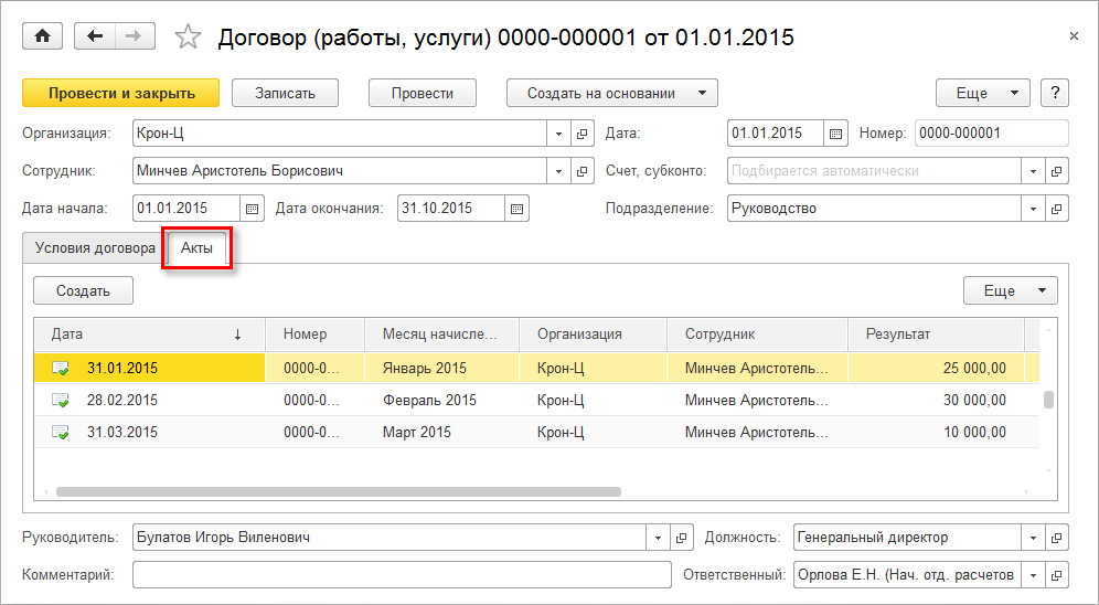 Для договоров ГПХ, оплачиваемых по актам выполненных работ, добавлена закладка «Акты». На ней отражаются все акты, введенные по этому договору, а также можно добавить новые.