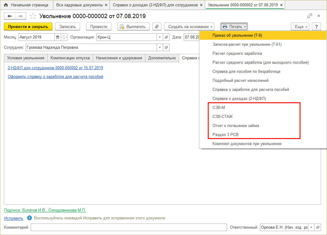 В эти документы добавлена закладка "Справки при увольнении", с которой можно либо оформить новые справки 2-НДФЛ и для расчета пособий, либо открыть ранее оформленные (последние). Так же, как и раньше, новые справки можно создать и через "Ввод на основании".