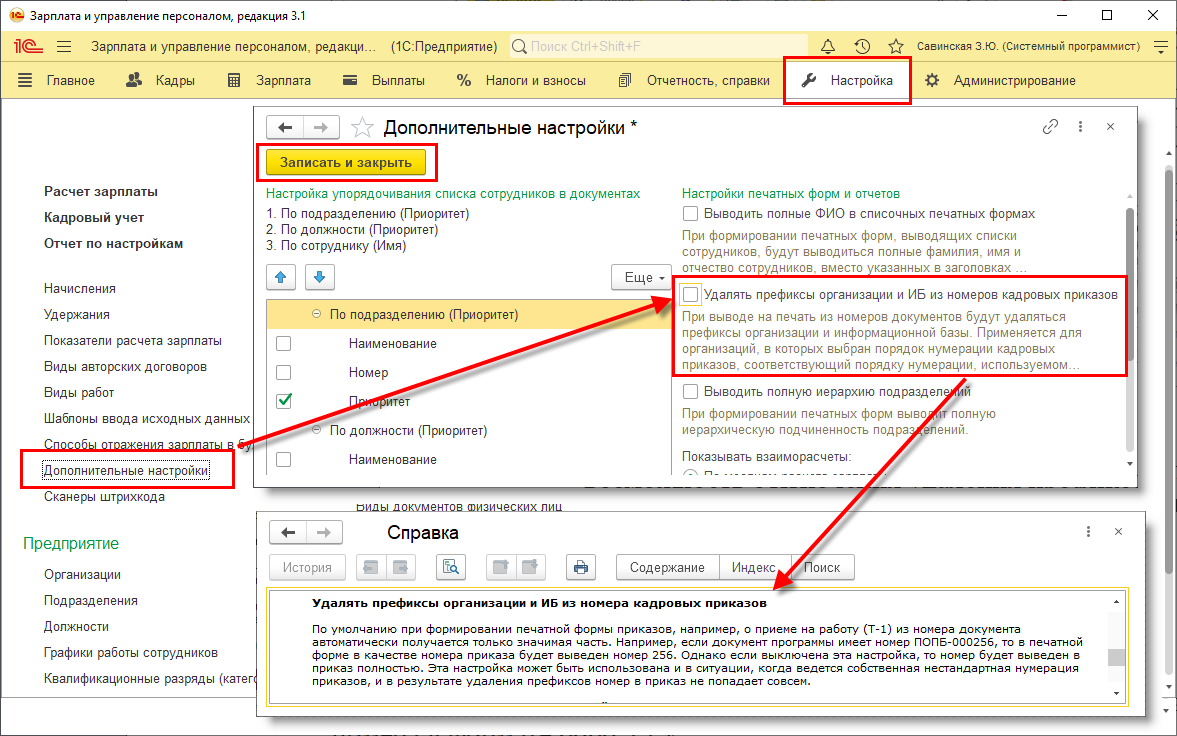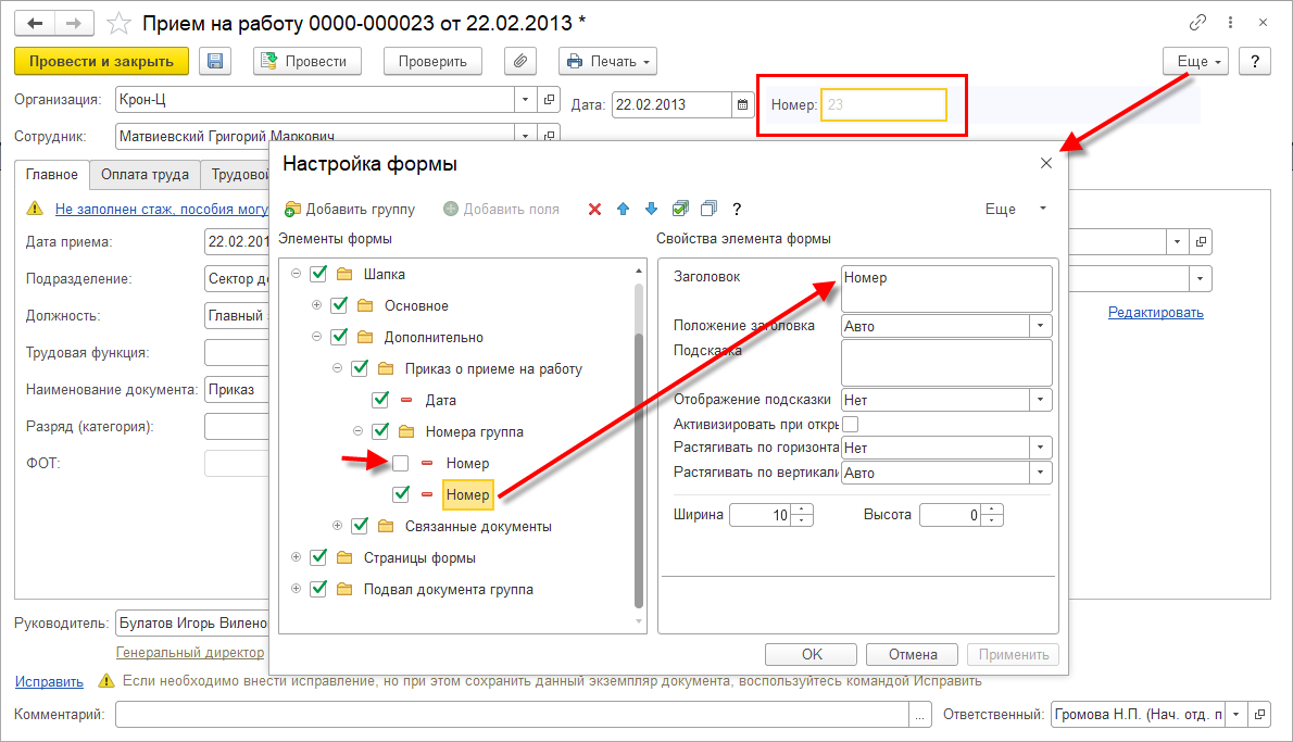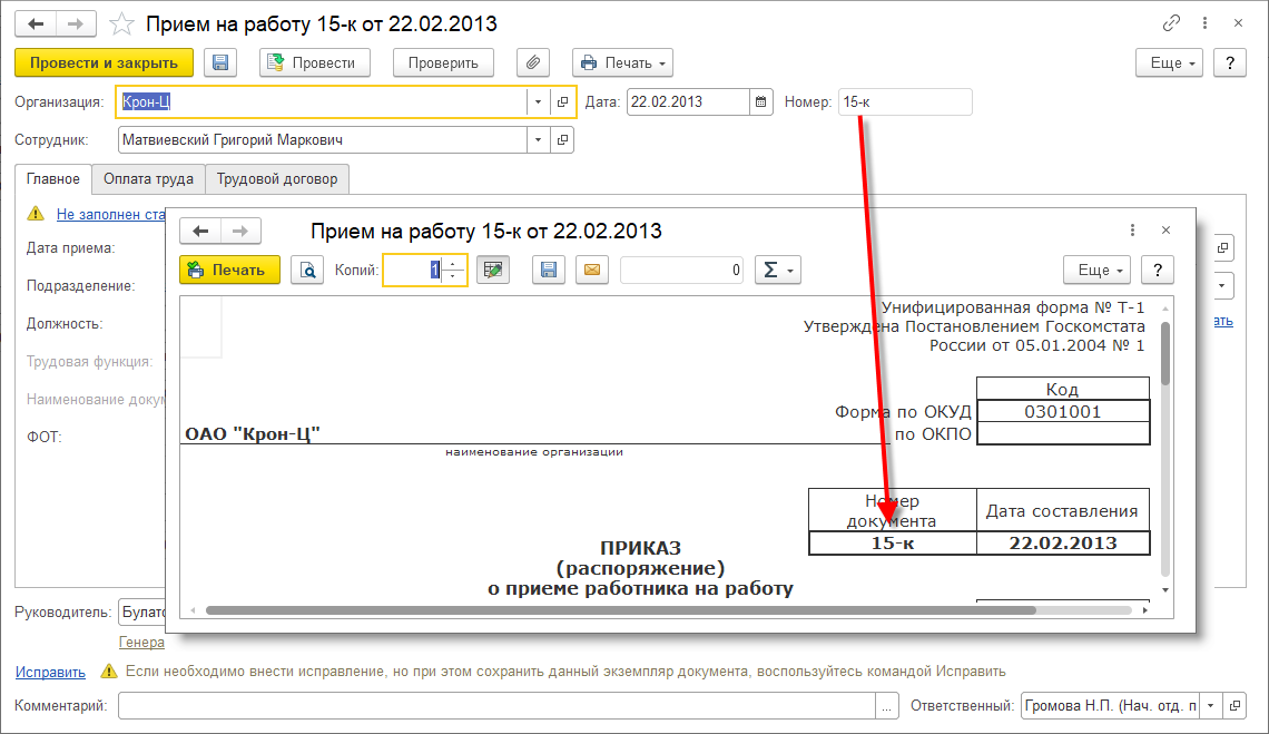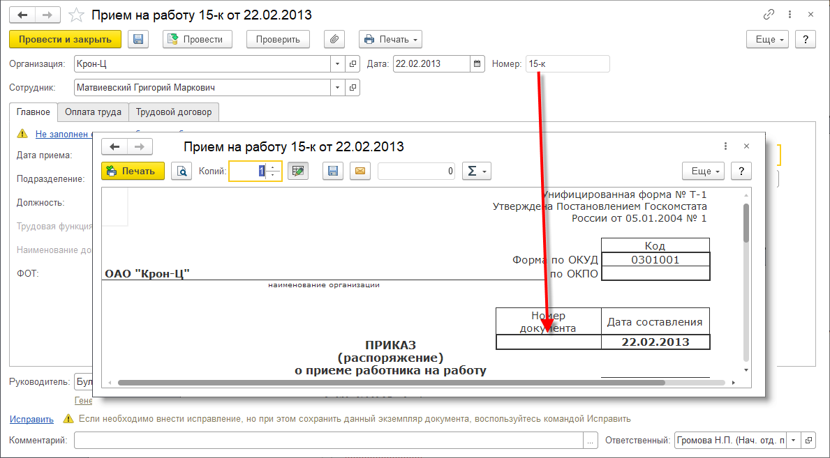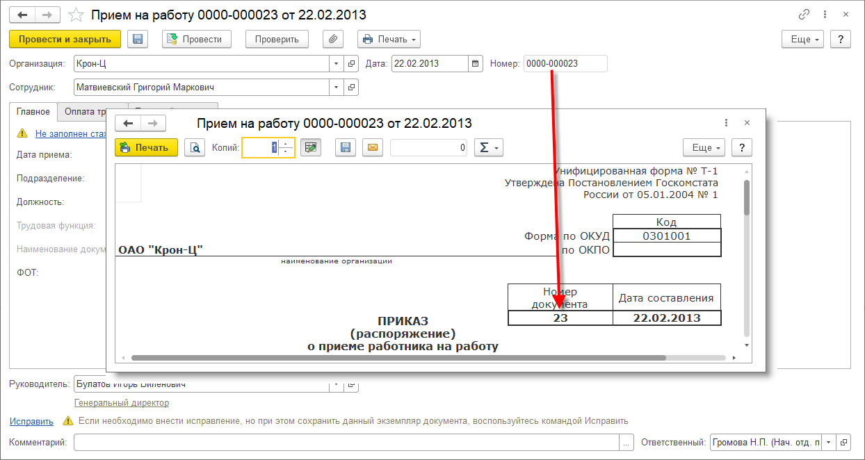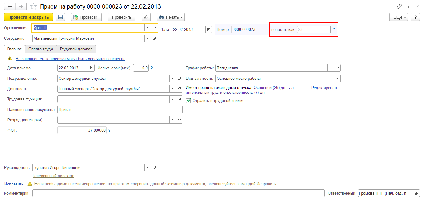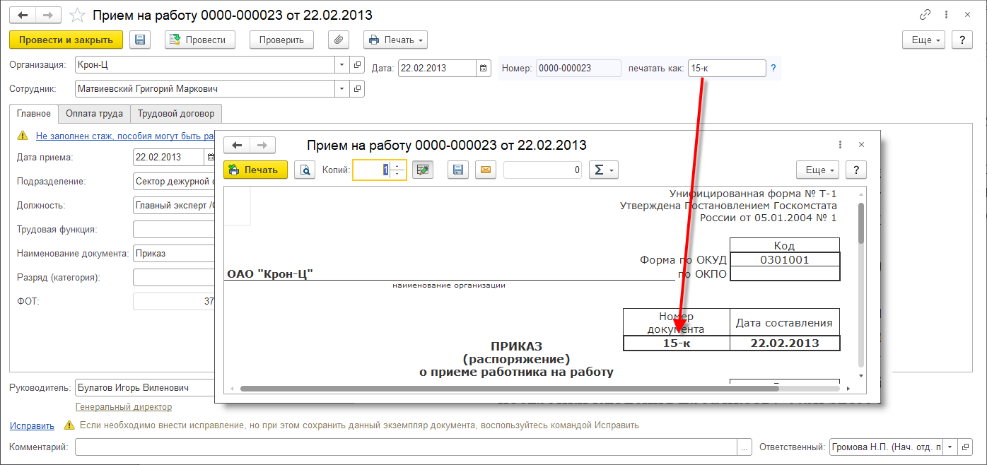 Но во многих случаях организациям требуется вести нумерацию по собственным правилам, связанным, например, с объединением бумажных кадровых приказов в тома для хранения в архивах или с ведением различных журналов. В прошлых версиях для этого приходилось либо вносить нужный номер в документ вручную (при этом каждый раз отвечая на предупреждение с вопросом "Продолжить редактирование?", что довольно неприятно), либо редактировать номер непосредственно в тех местах, куда он попадает из документа (в печатной форме, в мероприятии для электронной трудовой книжки). Наименее трудоемкий из этих вариантов – первый, но и он таит в себе "подводные камни". Если введенный вручную номер имеет вид, например, "12-к" или "1234-к", то при выводе на печать (и в другие места) первые два или четыре символа до дефиса считаются префиксом, а следующая после дефиса буква не является числом и поэтому не считается номером. В результате от номера ничего не остается.