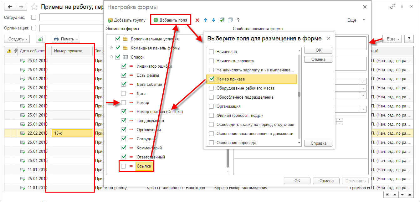 Аналогично, через меню "Еще – Изменить форму…" новое поле можно вывести в формы списков и журналов, и при необходимости скрыть старое.