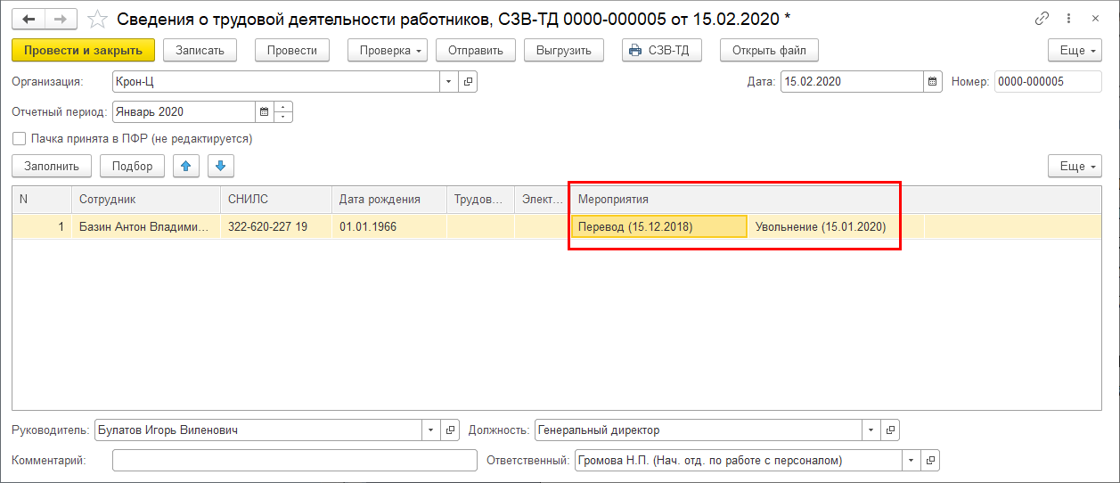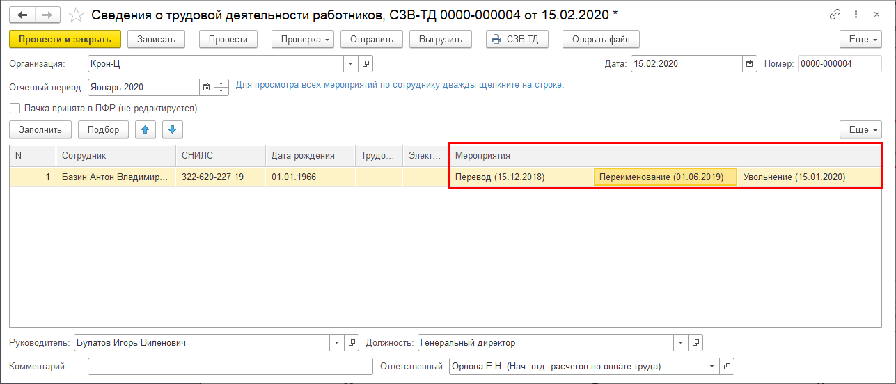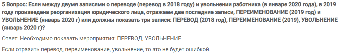 Мы дополнительно консультировались в ПФР по этому вопросу, и нам подтвердили, что до 2020 года обязательно нужно включить в отчет последний перевод или прием. Остальные виды мероприятий (в частности, переименование и установление), которые имели место после этого последнего, включать в отчет не обязательно. Но если их включить, ошибкой это также не будет.