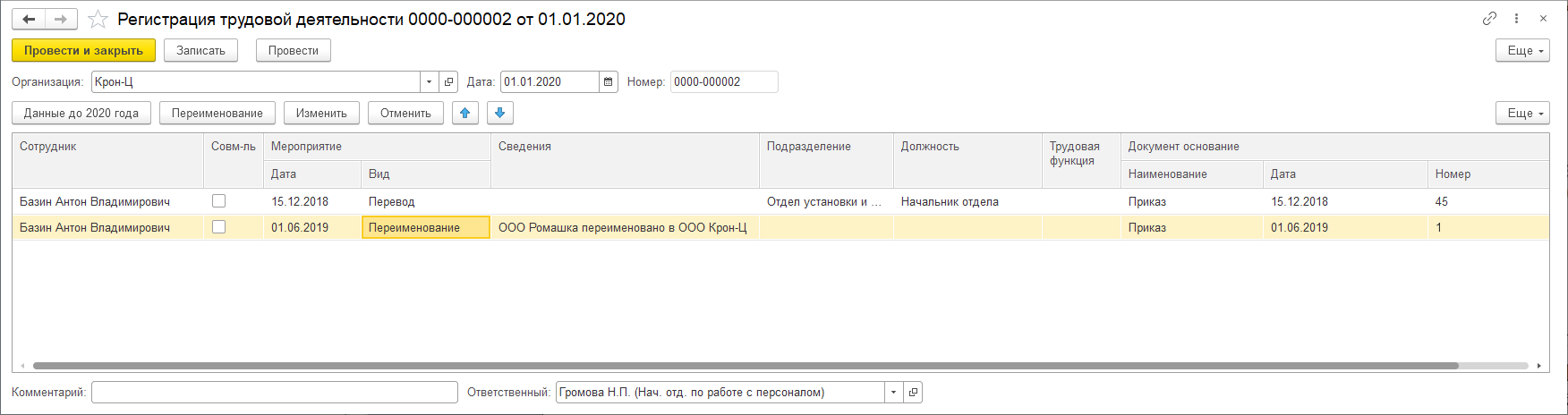 Ранее включить в отчет такие мероприятия (переименование, установление до 2020 года) возможности не было. Даже если внести его в документ "Регистрация трудовой деятельности":