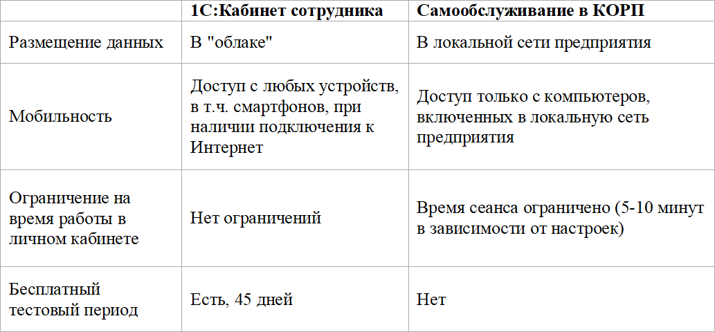 В версии КОРП ранее уже была предусмотрена аналогичная функциональность "Самообслуживание". Теперь есть и альтернативная возможность. При выборе того или иного варианта следует учитывать ключевые различия (помимо стоимости):