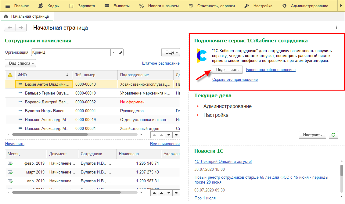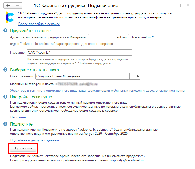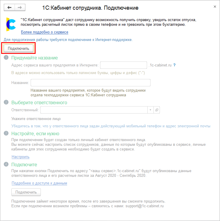 Подключение настраивается пользователем с полными правами. Настройка вызывается по кнопке Подключить на начальной странице, либо по ссылке Сервис 1С:Кабинет сотрудника в разделах Кадры или Зарплата.