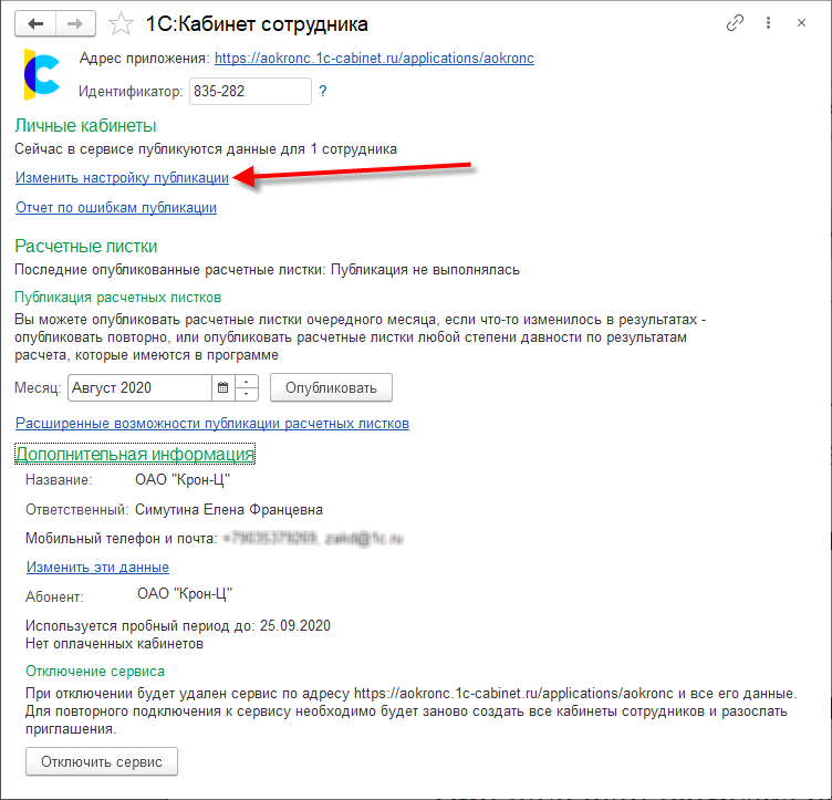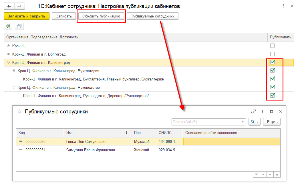 По кнопке Обновить публикацию информация по выбранным сотрудникам передается в сервис.