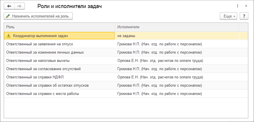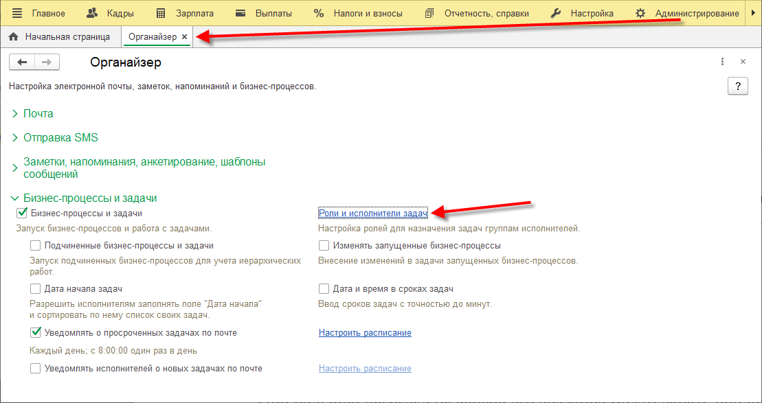 Для корректной адресации заявок сотрудников из сервиса необходимо указать исполнителей задач в разделе Администрирование – Органайзер – Бизнес-процессы и задачи – Роли и исполнители задач.