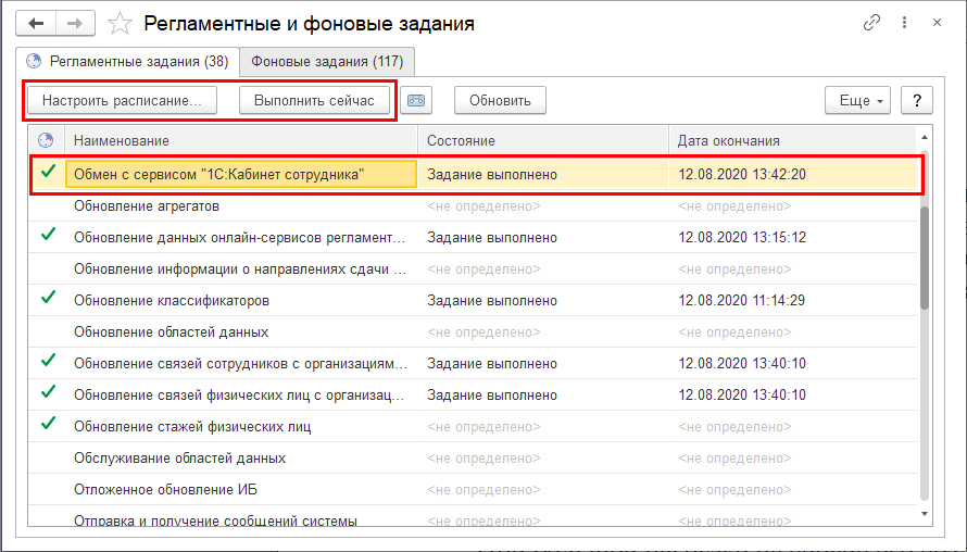 По умолчанию автоматический обмен информацией между приложением и сервисом выполняется каждые 10 минут. Изменить расписание или запустить обмен вручную можно из раздела Администрирование – Обслуживание – Регламентные операции – Регламентные и фоновые задания – регламентное задание Обмен с сервисом "1С:Кабинет сотрудника".