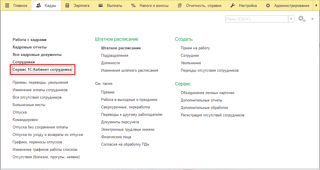 Если на этапе 3 сотрудники выбраны не были, то после подключения их можно указать в форме, открывающейся по ссылке Сервис 1С:Кабинет сотрудника в разделах Кадры или Зарплата.