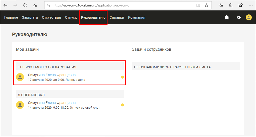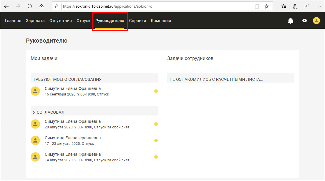 Сотрудникам, назначенным руководителям подразделений или организаций, доступен раздел Руководителю, в котором он может согласовывать отсутствия сотрудников, а также просматривать сотрудников, которые еще не ознакомились с расчетными листками (если включена такая настройка – см. рис. 3.5 выше).