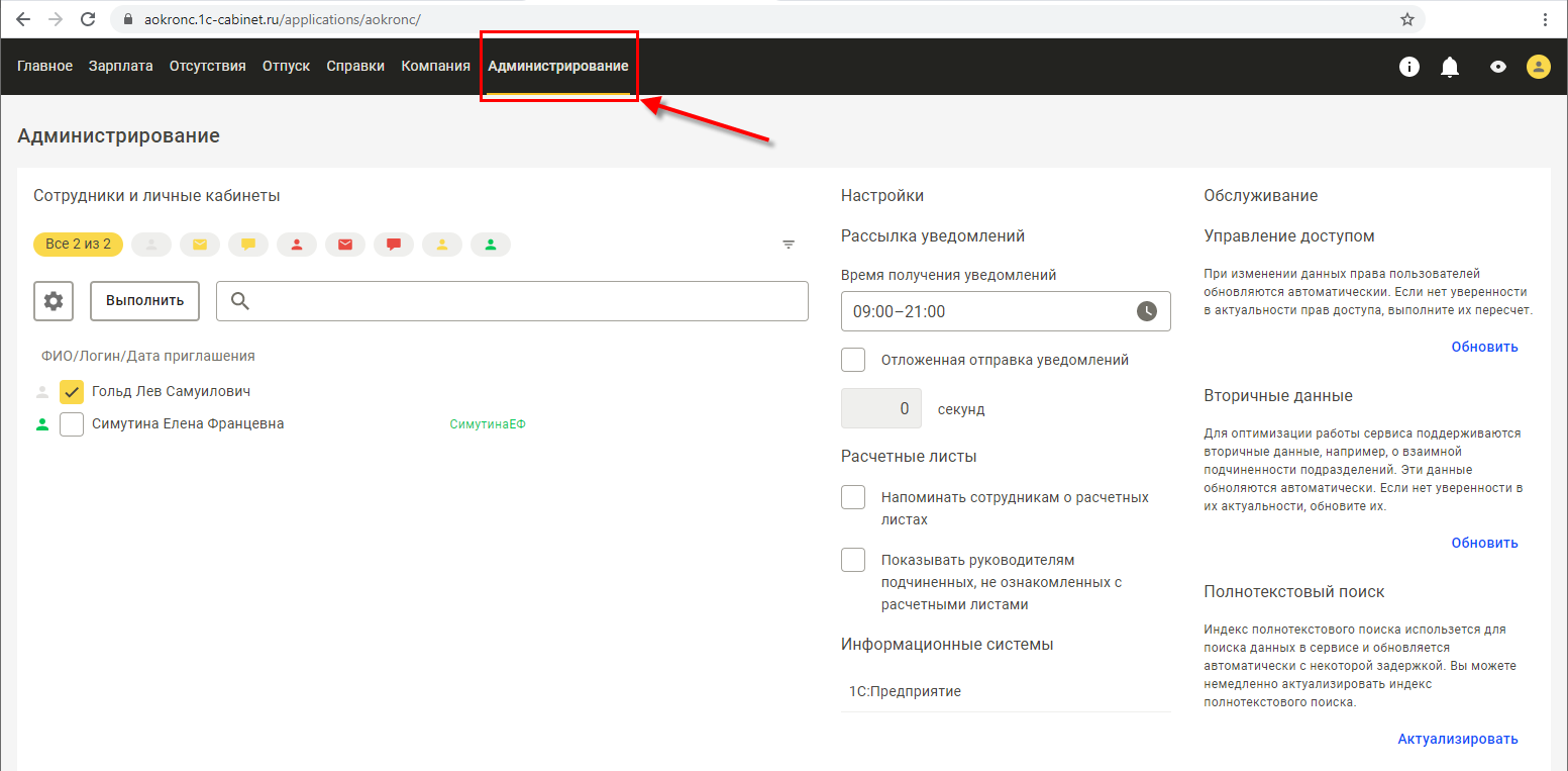 После создания сервиса и публикации в нем списка сотрудников нужно создать для них собственные кабинеты и отправить приглашения (если не было включено автоматическое создание – упомянуто далее в конце раздела). Эта возможность располагается в разделе Администрирование, который доступен только администратору сервиса. По умолчанию это ответственный, указанный при подключении, но права также могут быть назначены любому подключенному сотруднику здесь же, в его карточке.