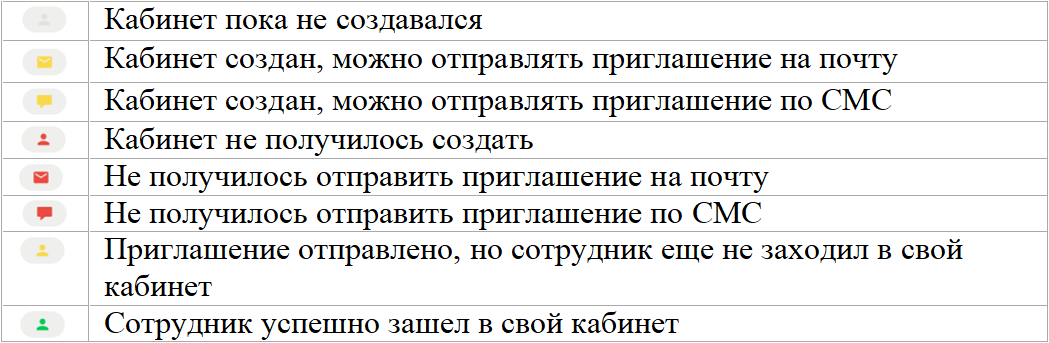После создания кабинетов сотрудникам необходимо отсюда же разослать приглашения на почту и/или по СМС. Сотрудники получат инструкцию по подключению, текст которой задан в форме по кнопке с шестеренкой (при необходимости его можно изменить). После подключения сотрудник получит доступ к своему кабинету, что отобразится соответствующей пиктограммой – зеленым человечком.