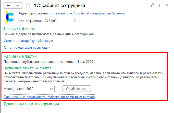 Пользователю с полным правами для этого достаточно перейти по ссылке Сервис 1С:Кабинет сотрудника в разделах Кадры или Зарплата, в открывшейся форме выбрать месяц и нажать Опубликовать.
