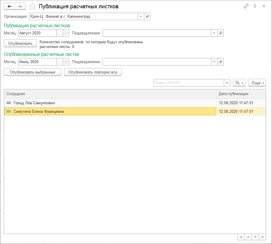Здесь же по ссылке Расширенные возможности публикации расчетных листков (или Публикация расчетных листков в разделе Зарплата – эта ссылка доступна пользователю без полных прав) можно выполнить более точечную публикацию листков.