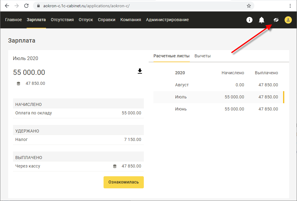 После публикации сотрудник увидит в кабинете свои расчетные листки. В целях безопасности при работе с компьютера по умолчанию суммы частично скрываются. Убедившись, что за спиной никого нет, сотрудник может включить полное отображение сумм, нажав на кнопку с изображением глаза в правом верхнем углу.