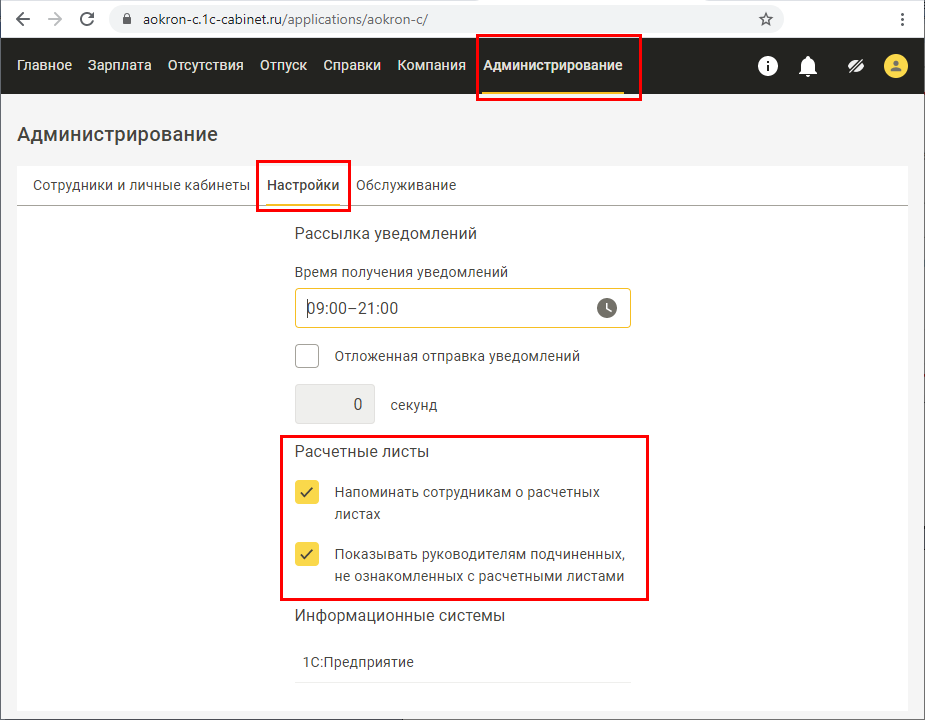 Администратор сервиса в разделе Администрирование может установить настройки, связанные с расчетными листками.