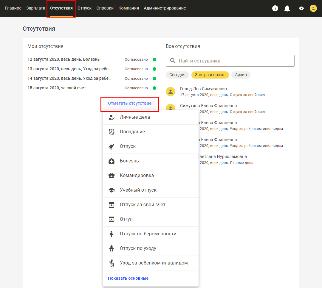 Сотрудник может заявить о своем отсутствии, чтобы согласовать его со своим руководителем и/или кадровой службой, а также чтобы информировать об этом остальных сотрудников.