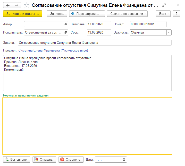На основании этой информации пользователь может ввести в программу соответствующий документ, регистрирующий отсутствие. После этого задачу нужно отметить как выполненную, чтобы сотрудник увидел это в своём кабинете.