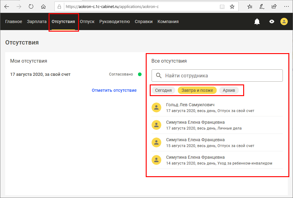 Информация о согласованных отсутствиях других сотрудников доступна для просмотра в области Все отсутствия. В ней предусмотрен отбор по периоду.