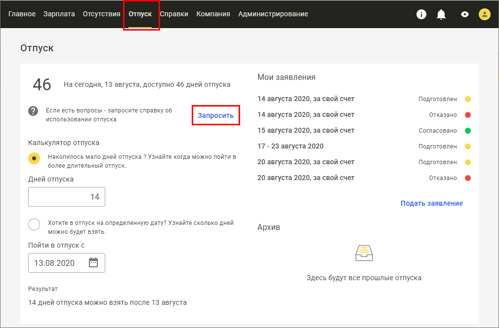 В разделе Отпуск сотрудник может просматривать информацию по остатку отпуска, а также запросить более подробную справку об отпусках. Также он может подать заявление на отпуск – точно так же, как и из рассмотренного выше раздела Отсутствия.