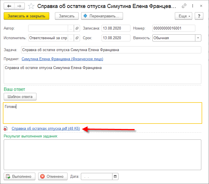 При заказе сотрудником справки, пользователю, назначенному ответственным за справки об остатках отпусков (см. рис. 1.13 выше), будет создана соответствующая задача в программе в разделе Главное – Сервис – Мои задачи. К задаче автоматически прикрепляется запрошенная сотрудником справка. Достаточно нажать Выполнено, и справка уйдёт в кабинет сотрудника. Если по какой-то причине справка сформировалась неправильно, то по пиктограмме слева от неё её можно удалить и приложить новую взамен.