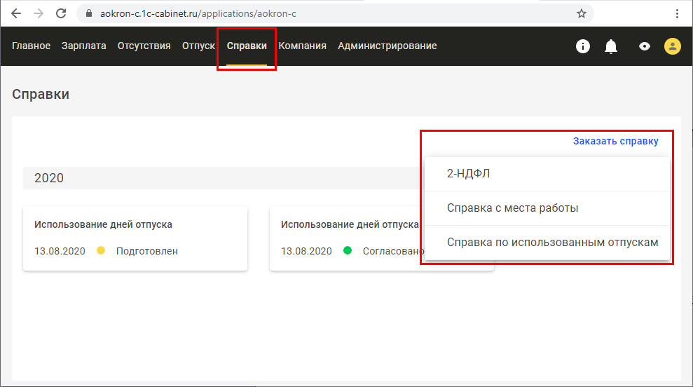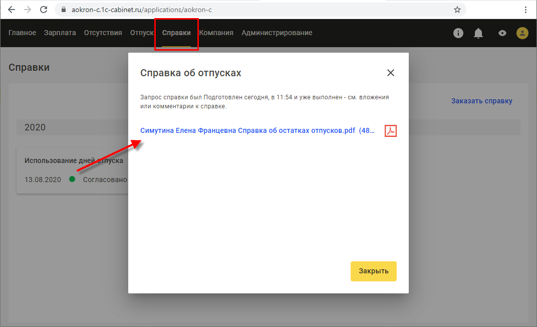 Сотрудник увидит запрошенную справку в разделах Отпуск и Справки своего кабинета.