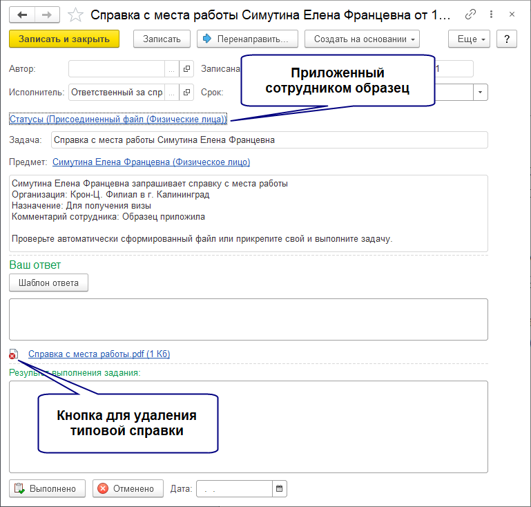 При заказе справки с места работы к задаче автоматически прикрепляется справка по реализованной в программе форме. Достаточно нажать Выполнено, и справка уйдёт в кабинет сотрудника.