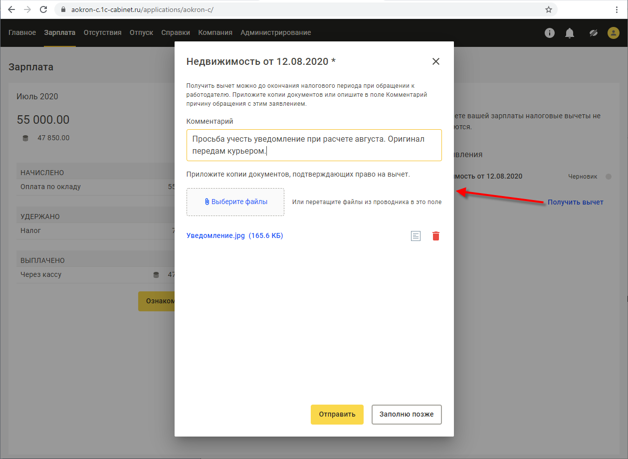 Сотрудник может направить из кабинета (раздел Зарплата - Вычеты) заявление на предоставление того или иного вычета по НДФЛ. Предполагается, что сотрудник прилагает скан-копии необходимых документов (заявления, уведомления).