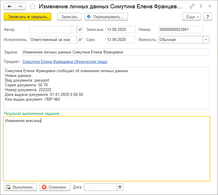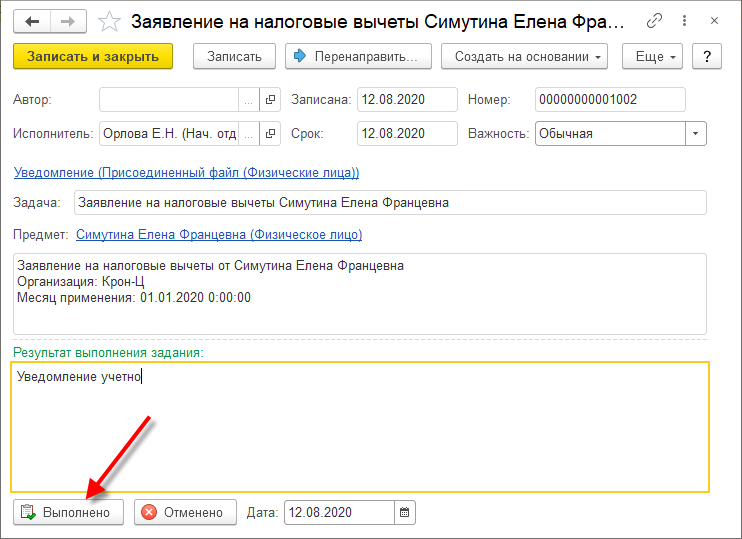 После регистрации в программе такого документа задачу нужно отметить как выполненную, чтобы сотрудник увидел это в своём кабинете.