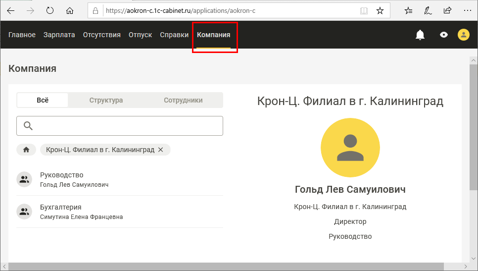 В разделе "Компания" сотрудники могут ознакомиться со структурой компании, со списком её сотрудников.