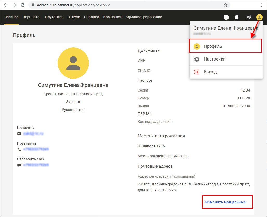 Сотрудник может направить заявку на внесение изменений в его личные данные.