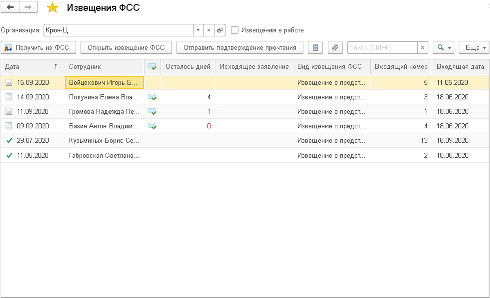 Новый документ так и называется: "Извещения ФСС". По кнопке "Получить из ФСС" пользователь получает извещения. Флажок "Извещения в работе" позволяет скрывать извещения, которые пользователь уже обработал.