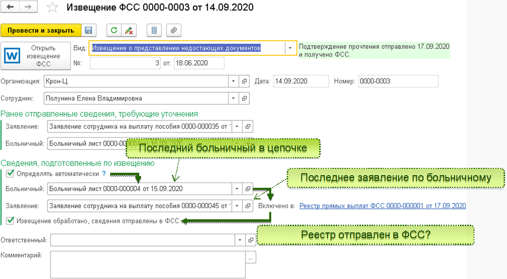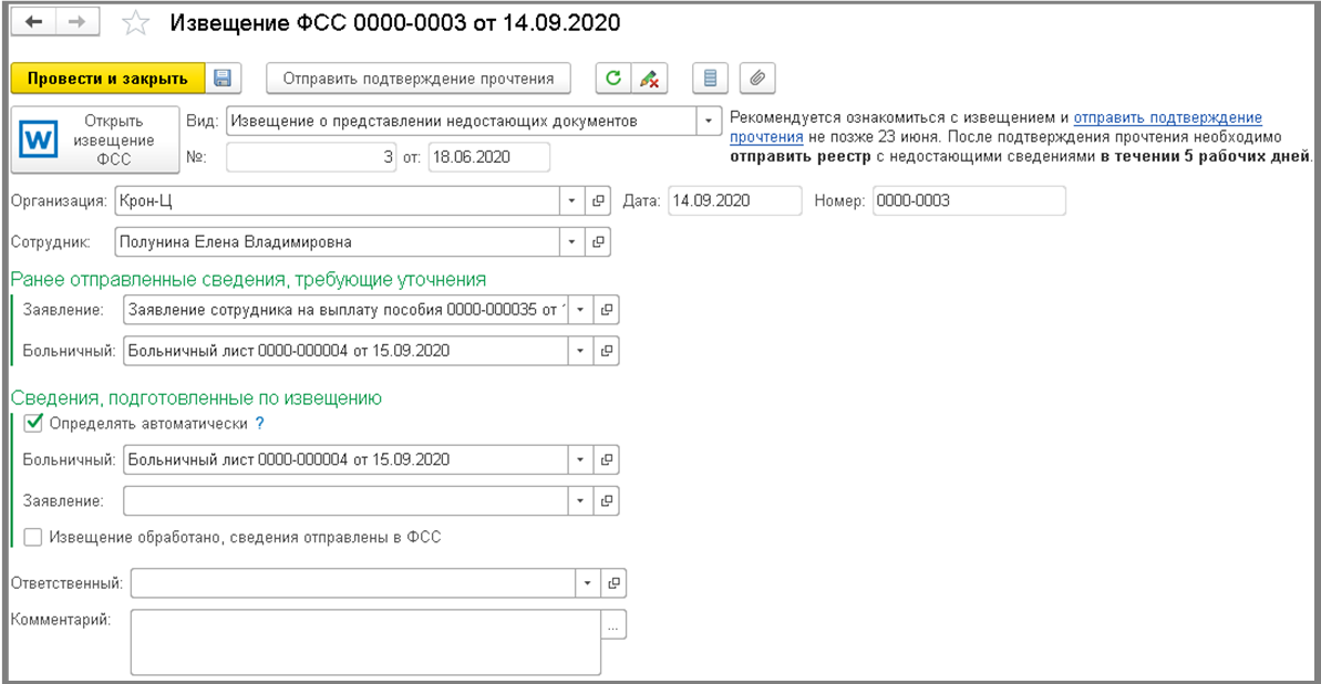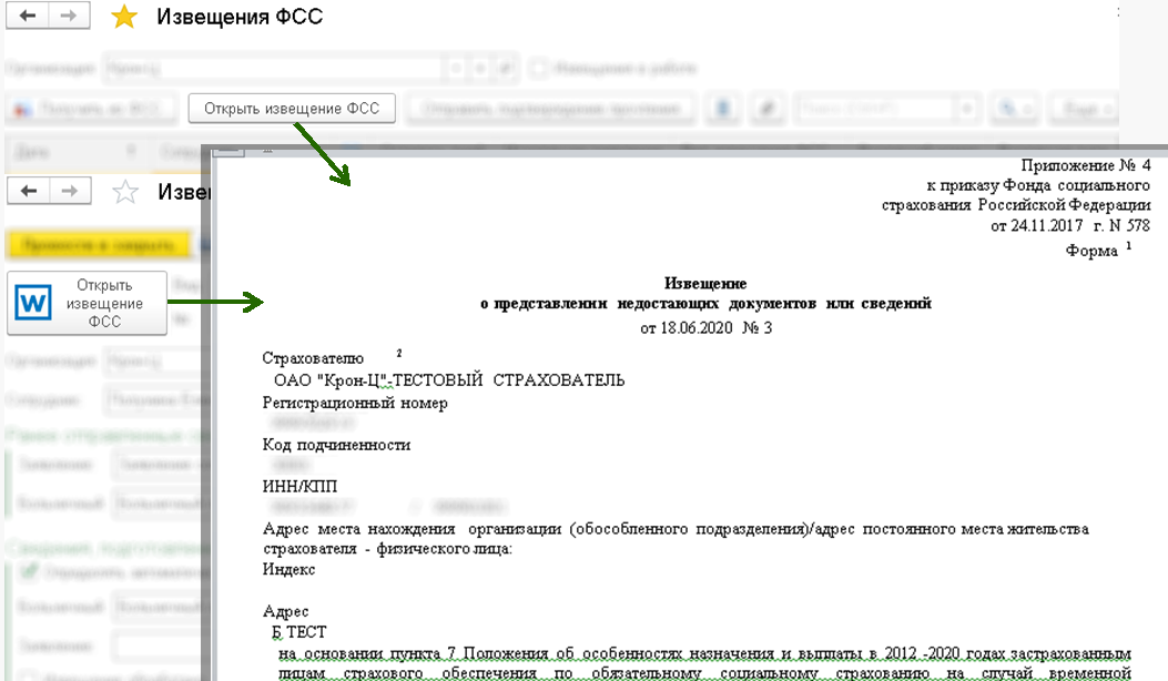 По кнопке "Открыть извещение ФСС" открывается документ, который прислали из ФСС. Пользователь должен ознакомиться с документом и понять, что от него требует ФСС.