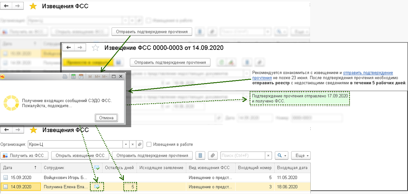 После этого можно отправить подтверждение прочтения. После отправки подтверждения начинается отсчет 5 рабочих дней, необходимых для предоставления недостающих сведений. А если пользователь в течение 3 дней не отправит подтверждение прочтения, то ФСС отправит извещение заказным письмом. ФСС грозятся, что если страхователь будет забывать отправлять подтверждения о прочтении, его могут отключить от СЭДО. Поэтому рекомендуем не забывать отправлять подтверждение.