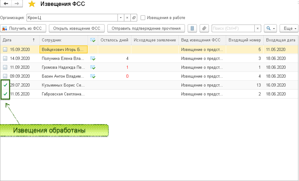 В списке признак обработки извещения отображается зеленым флажком.