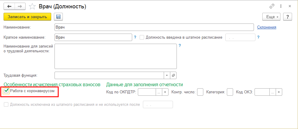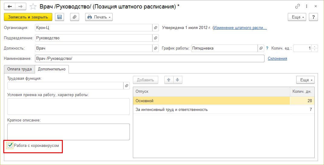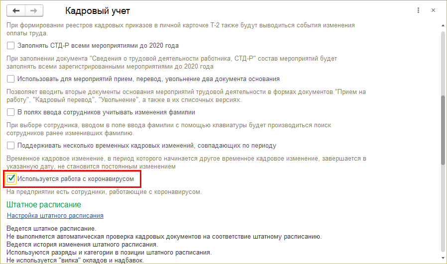 После ее включения в карточке должности и позиции штатного расписания появляется возможность указать, что на ней выполняется работа с коронавирусом.
