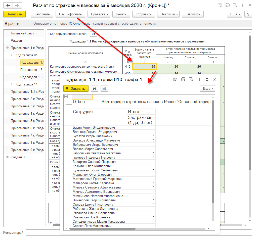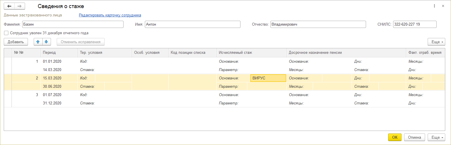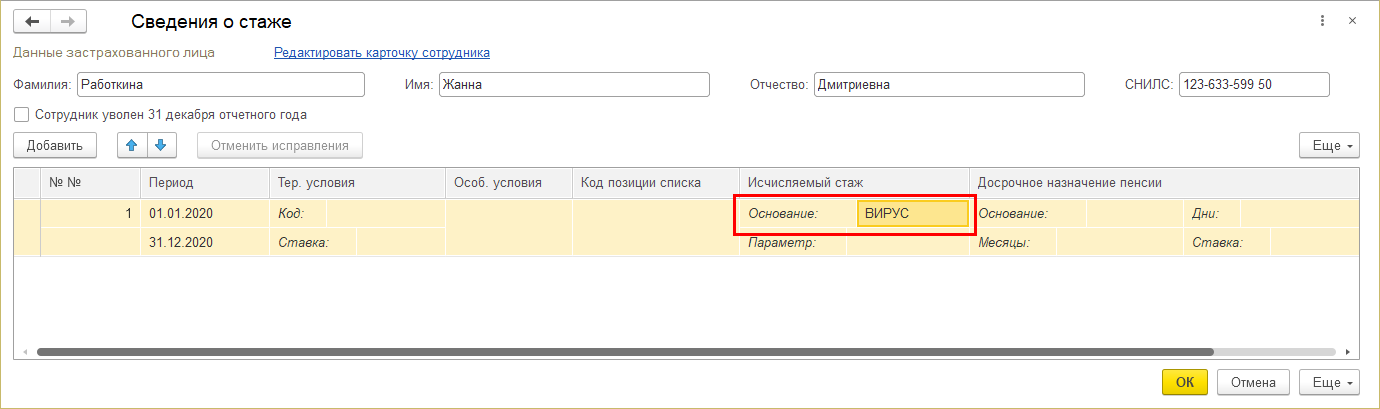 Если этот признак установить, то стаж автоматически заполняется с кодом ВИРУС на весь отчетный период.