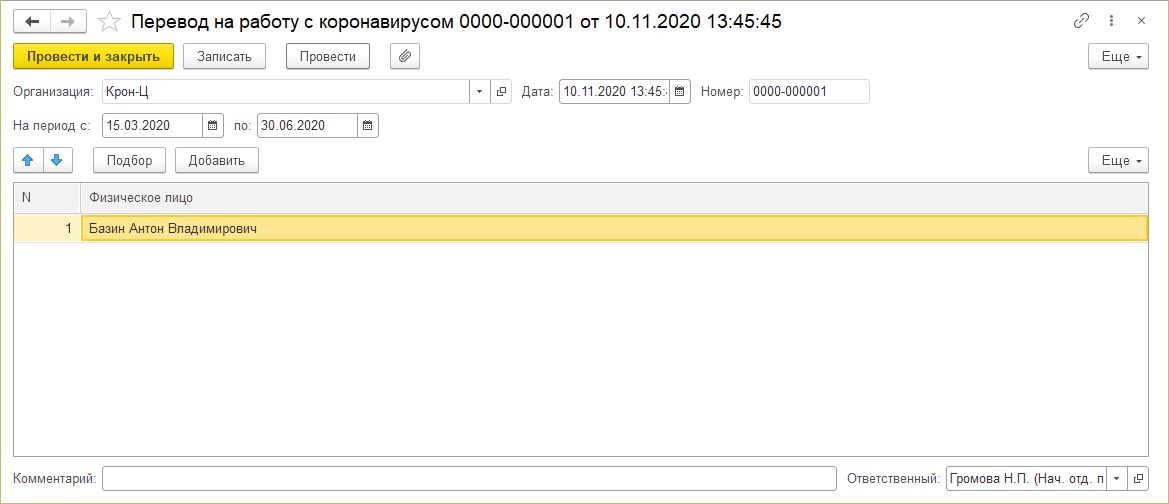 Также добавлен документ "Перевод на работу с коронавирусом" (в журнал "Все кадровые документы").
