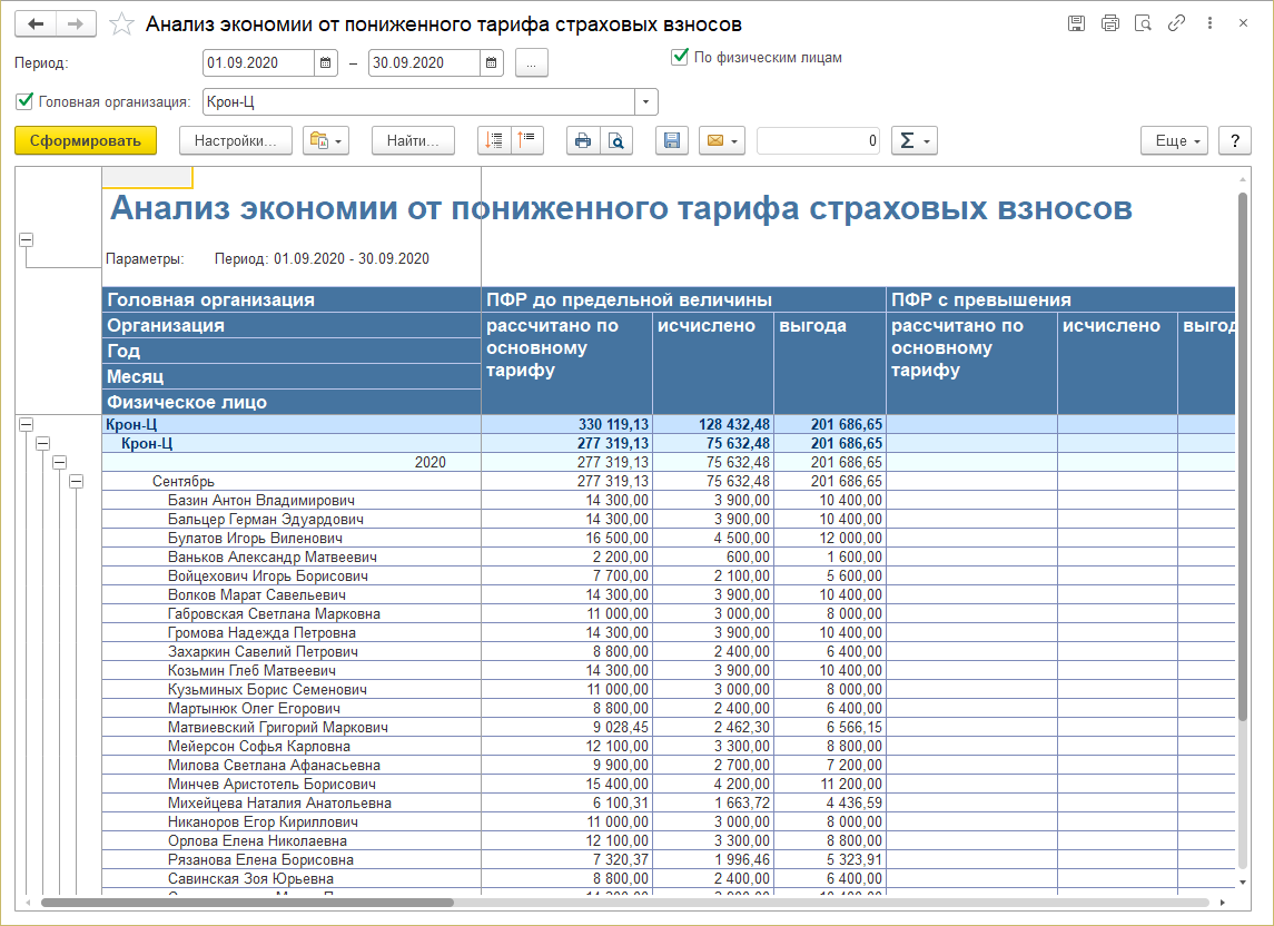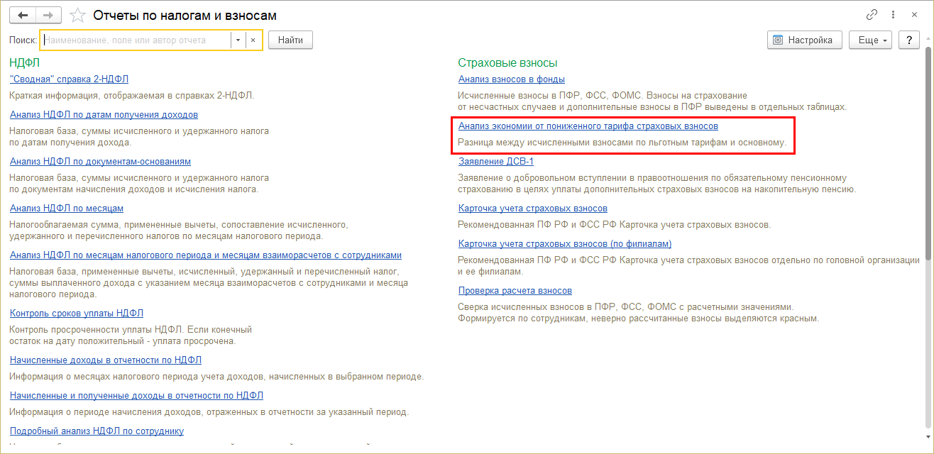Добавлен отчет "Анализ экономии от пониженного тарифа страховых взносов" для удобства соблюдения условий Федерального закона от 13.07.2020 № 204-ФЗ.