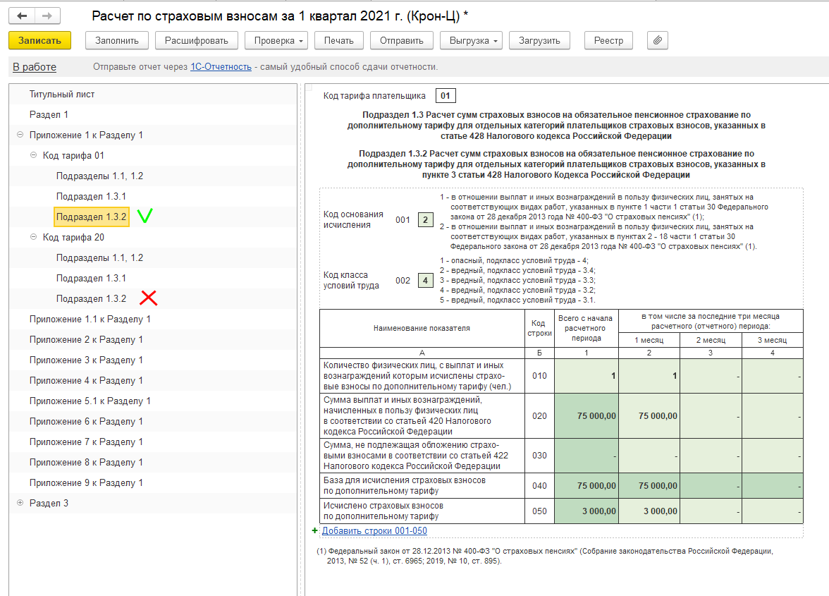 По многочисленным просьбам пользователей, применяющих тариф страховых взносов для МСП, в отчете РСВ, начиная с 1 кв. 2021 года, данные о дополнительных взносах за вредные условия труда отображаются общими суммами в разделе с кодом 01.