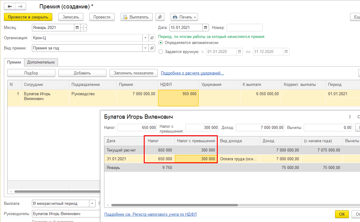 По умолчанию настройка выключена – в подавляющем большинстве организаций в первые месяцы года база не превысит 5 млн. ни по одному сотруднику (или вовсе никогда не достигнет). Настройку нужно включить в том месяце, когда база у кого-либо достигнет 5 млн. Например, в январе ее нужно включить, если выплачивается "13-ая зарплата" или дивиденды в размере свыше 5 млн. В очередных версиях настройка будет включаться автоматически при накоплении предельной суммы дохода хотя бы одним из сотрудников.