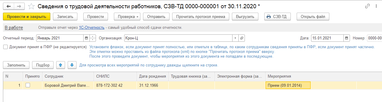 Реализовано автоматическое заполнение в СЗВ-ТД, введенном в 2021 году (дата документа и отчетный период относятся к 2021 году) мероприятий до 2020 года, зарегистрированных, но еще не отправленных в 2020 году, согласно п. 1.7 порядка заполнения СЗВ-ТД.