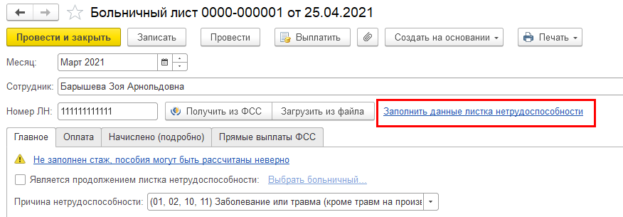 внимание, что в больничном ссылка "Заполнить данные для реестра,