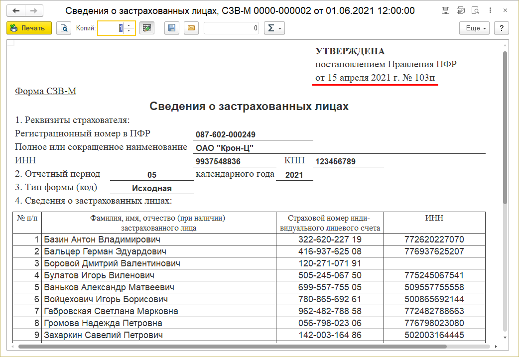 Выполнено обновление печатной формы СЗВ-М с 30.05.2021, в соответствии с Постановлением Правления ПФ РФ от 15.04.2021 № 103п.