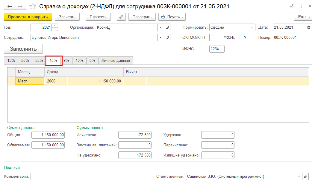 В справках 2-НДФЛ для сотрудников реализовано выделение доходов, превышающих 5 млн. руб., в раздел по ставке 15%.