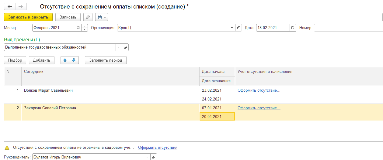 Добавлен новый документ "Отсутствие с сохранением оплаты списком". Работа с документом аналогична работе с документом "Командировка группы".